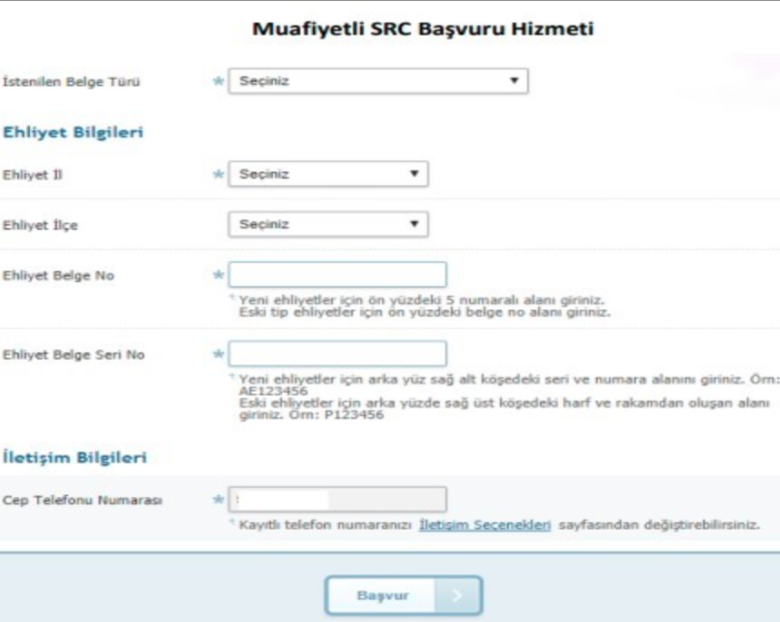 • Ehliyet Belge No : Yeni ehliyetler için ön yüzdeki 5 numaralı alanı girilecektir. Eski tip ehliyetler için ön yüzdeki belge no alanı girilecektir.